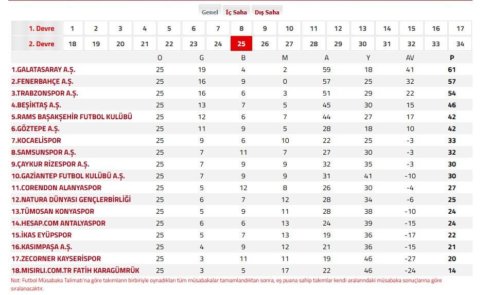 O G B M A Y AV P 1.GALATASARAY 25 19 4 2 59 18 41 61 2.FENERBAHÇE 25 16 9 0 57 25 32 57 3.TRABZONSPOR 25 16 6 3 51 29 22 54 4.BEŞİKTAŞ 25 13 7 5 45 30 15 46 5.RAMS BAŞAKŞEHİR FUTBOL KULÜBÜ 25 12 6 7 44 27 17 42 6.GÖZTEPE 25 11 9 5 28 18 10 42 7.KOCAELİSPOR 25 9 6 10 22 25 -3 33 8.SAMSUNSPOR 25 7 11 7 27 30 -3 32 9.ÇAYKUR RİZESPOR 25 7 9 9 32 35 -3 30 10.GAZİANTEP FUTBOL KULÜBÜ 25 7 9 9 31 41 -10 30 11.CORENDON ALANYASPOR 25 5 12 8 26 30 -4 27 12.NATURA DÜNYASI GENÇLERBİRLİĞİ 25 6 7 12 28 34 -6 25 13.TÜMOSAN KONYASPOR 25 5 9 11 28 38 -10 24 14.HESAP.COM ANTALYASPOR 25 6 6 13 24 39 -15 24 15.İKAS EYÜPSPOR 25 5 7 13 19 36 -17 22 16.KASIMPAŞA 25 4 9 12 21 36 -15 21 17.ZECORNER KAYSERİSPOR 25 3 11 11 19 46 -27 20 18.MISIRLI.COM.TR FATİH KARAGÜMRÜK 25 3 5 17 22 46 -24 14