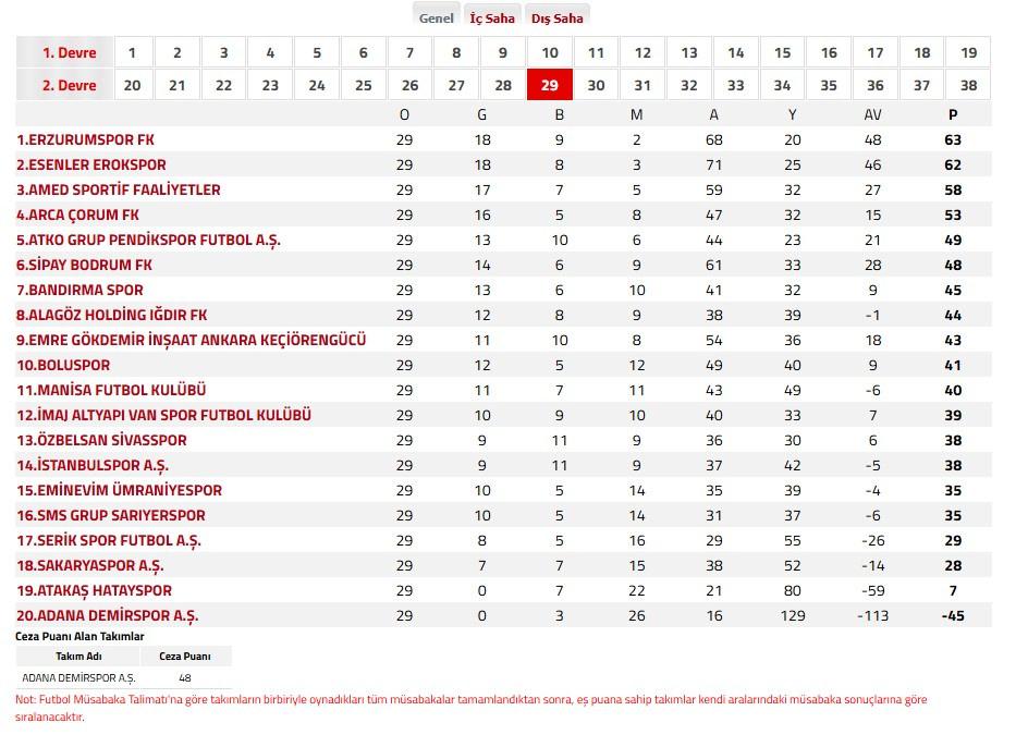 O G B M A Y AV P 1.ERZURUMSPOR 29 18 9 2 68 20 48 63 2.ESENLER EROKSPOR 29 18 8 3 71 25 46 62 3.AMED SPORTİF FAALİYETLER 29 17 7 5 59 32 27 58 4.ARCA ÇORUM FK 29 16 5 8 47 32 15 53 5.ATKO GRUP PENDİKSPOR 29 13 10 6 44 23 21 49 6.SİPAY BODRUM FK 29 14 6 9 61 33 28 48 7.BANDIRMASPOR 29 13 6 10 41 32 9 45 8.ALAGÖZ HOLDİNG IĞDIR FK 29 12 8 9 38 39 -1 44 9.EMRE GÖKDEMİR İNŞAAT ANKARA KEÇİÖRENGÜCÜ 29 11 10 8 54 36 18 43 10.BOLUSPOR 29 12 5 12 49 40 9 41 11.MANİSA FK 29 11 7 11 43 49 -6 40 12.İMAJ ALTYAPI VANSPOR 29 10 9 10 40 33 7 39 13.ÖZBELSAN SİVASSPOR 29 9 11 9 36 30 6 38 14.İSTANBULSPOR 29 9 11 9 37 42 -5 38 15.EMİNEVİM ÜMRANİYESPOR 29 10 5 14 35 39 -4 35 16.SMS GRUP SARIYER 29 10 5 14 31 37 -6 35 17.SERİKSPOR 29 8 5 16 29 55 -26 29 18.SAKARYASPOR 29 7 7 15 38 52 -14 28 19.ATAKAŞ HATAYSPOR 29 0 7 22 21 80 -59 7 20.ADANA DEMİRSPOR 29 0 3 26 16 129 -113 -45NOT: Adana Demirspor'a 48 puan silme cezası verildi.