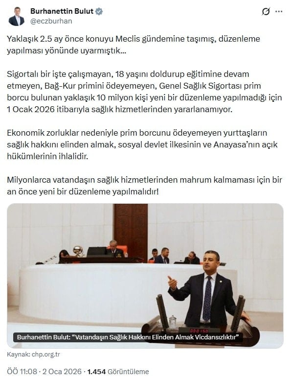 Yaklaşık 10 milyon kişinin sağlık hizmetlerinden mahrum kalmasının ciddi bir toplumsal sorun yaratacağını vurgulayan Bulut, “Bu tablo sosyal devlet anlayışıyla bağdaşmıyor” dedi.