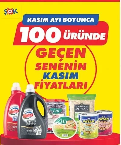 ŞOK Marketler, kasım ayında yeni bir kampanya başlattığını duyurdu. Bu kapsamda 1-30 Kasım tarihleri arasında ŞOK Marketler'de 100 ürün, geçen senenin kasım ayındaki fiyatlarıyla satışa sunuluyor. Kampanyaya dahil ürünler arasında konserveden bakliyata, peynir ve zeytinden hijyen ürünlerine temel gıda ve temizlik ürünleri bulunuyor. Kampanya kapsamındaki ürünler web adresinden incelenebiliyor.