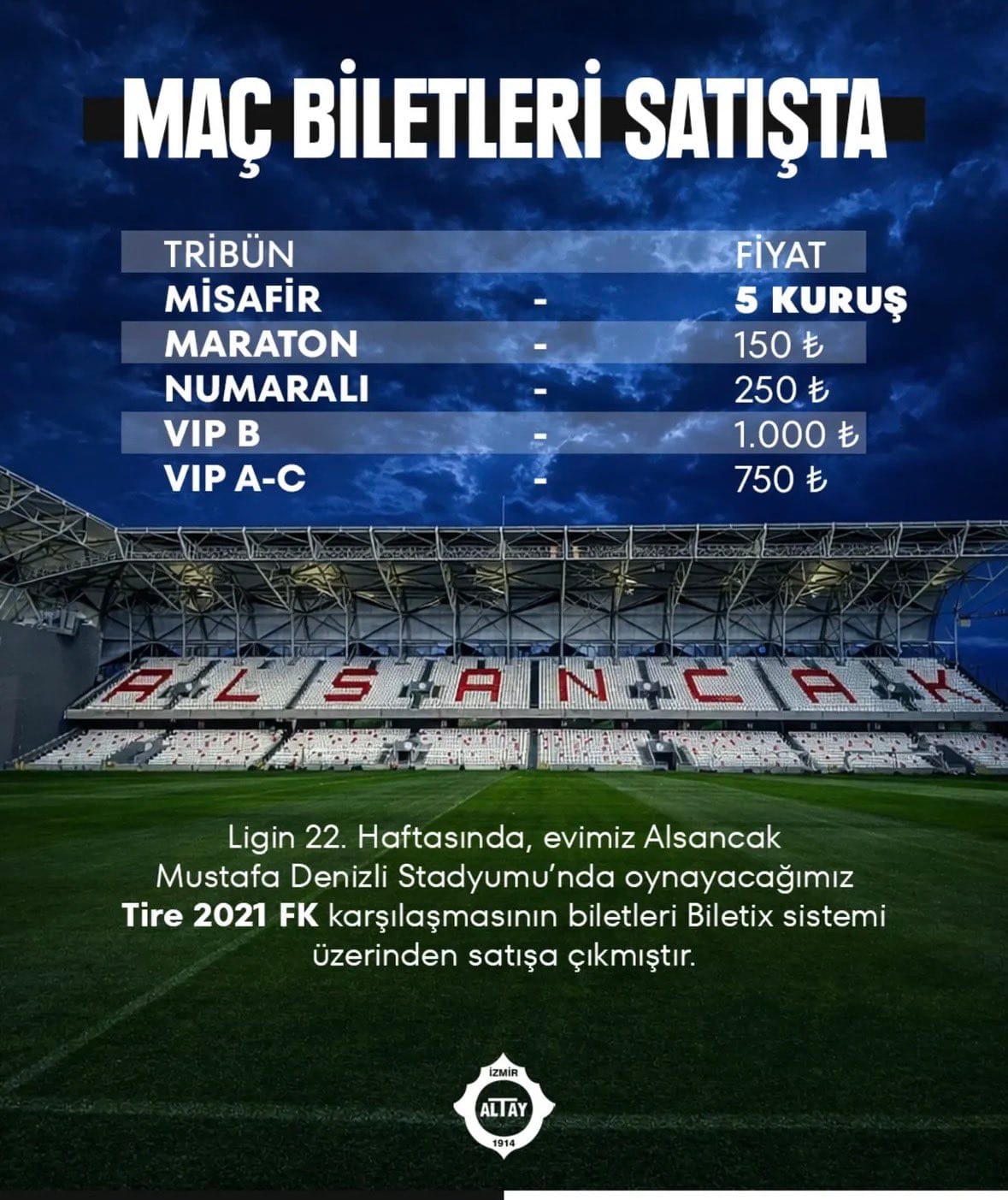 Altay, Tire 2021 maçının bilet fiyatlarını duyurdu.