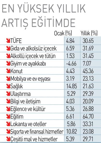 TÜFE'de en yüksek aylık artışlar yüzde 14.85 ile sağlık, yüzde 10.82 ile sigorta ve finansal hizmetler ve yüzde 6.61 ile eğitim grubunda görüldü. Gıda ve alkolsüz içeceklerde yüzde 6.59, ulaştırmada yüzde 5.29 artış ve konut, su, elektrik, gaz ve diğer yakıtlarda yüzde 4.43 artış olarak gerçekleşti. Yıllık enflasyonun en yüksek olduğu gruplar yüzde 64.70 ile eğitim ve yüzde 45.36 ile konut oldu. Gıda ve alkolsüz içeceklerde yüzde 31.69, ulaştırmada yüzde 29.39 ve konut, su, elektrik, gaz ve diğer yakıtlarda yüzde 45.36 artış olarak gerçekleşti. Çekirdek enflasyon 50 ay sonra yüzde 30'un altına indi.