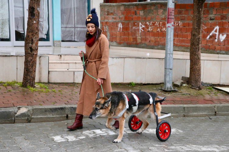 Erbuğ'un ulaştığı Çelik, Roma için özel yürüteç tasarladı. Yürüteç sayesinde ayaklanan köpek, sahibiyle gezintiye çıkıyor.