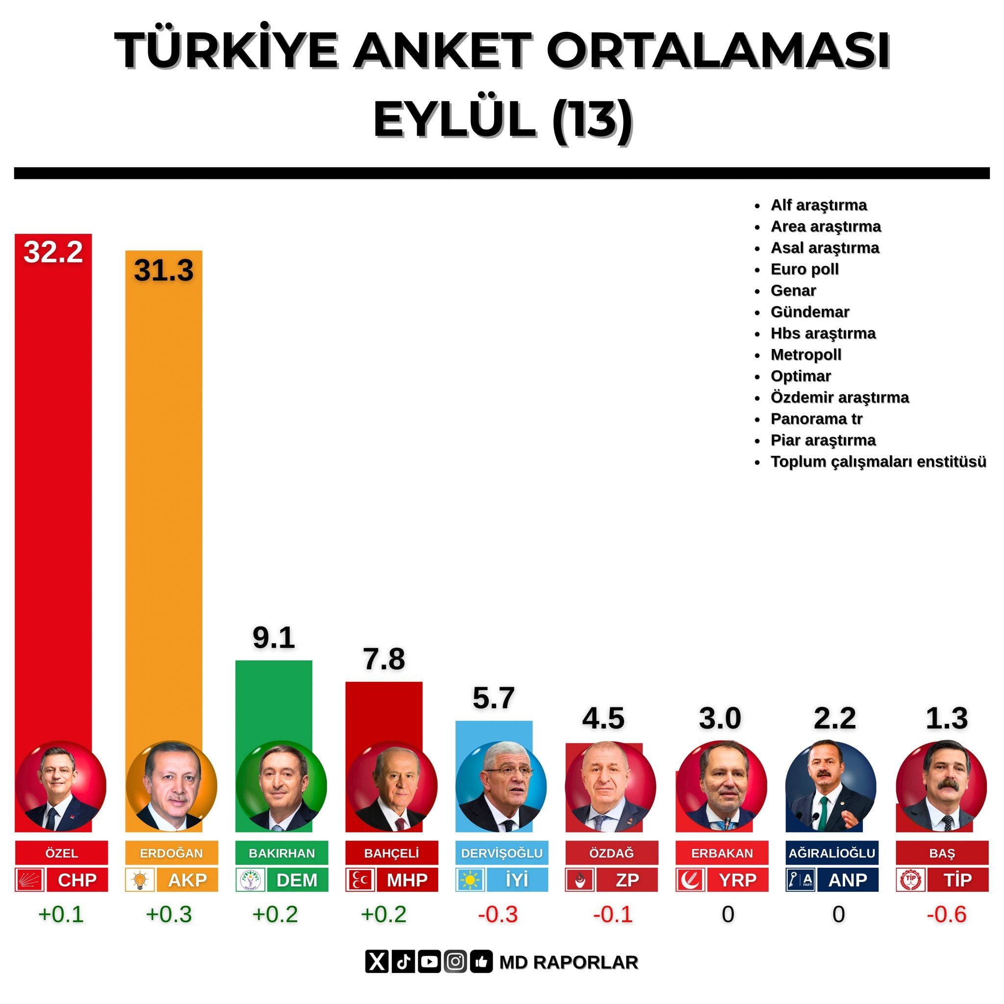 MDRaporlar'ın listelediği anket ortalamasına göre; CHP listede ilk sırada yer aldı.