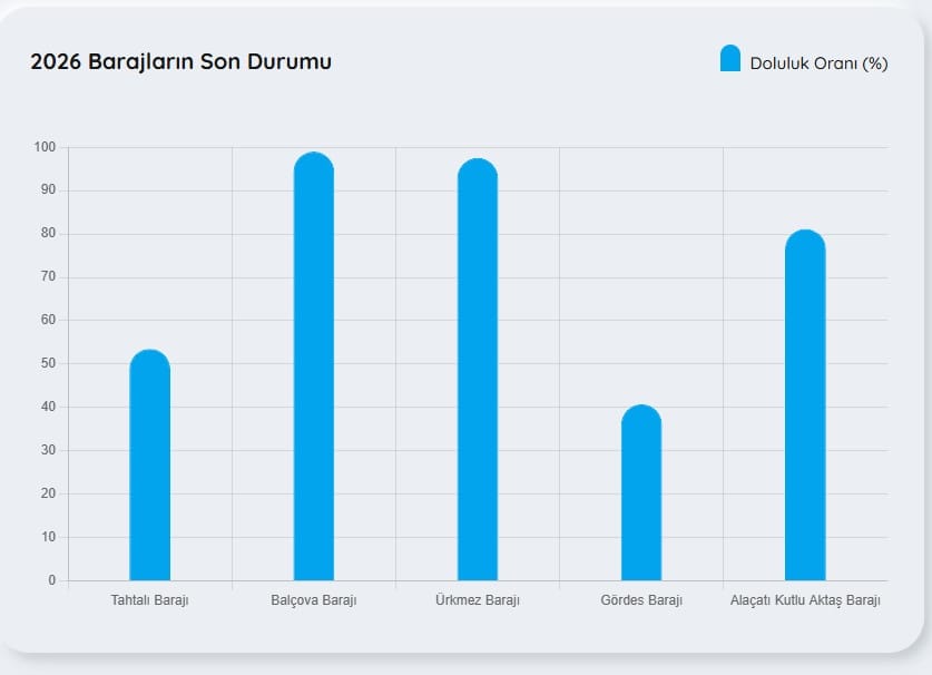 Tahtalı Barajı: %53,52Balçova Barajı: %99,00Ürkmez Barajı: %97,55Gördes Barajı: %40,75Alaçatı Kutlu Aktaş Barajı: %81,18İZMİRLİLERE BÜYÜK MÜJDE: 2035 YILINA KADAR RİSK YOKUzmanlar Gördes Barajı’ndaki teknik sorunların giderilmesinin suyun tutulmasında büyük payı olduğunu vurguluyor. Prof. Dr. Yaşar tarafından yapılan değerlendirmelerde Gördes’in kapasite olarak Tahtalı’dan bile büyük olduğu gerçeği hatırlatıldı.