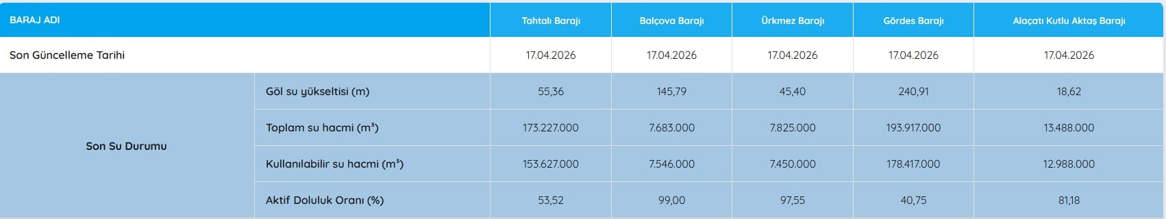 İZMİR BARAJLARINDA SON DURUM (İZSU VERİLERİYLE)17 Nisan 2026 itibarıyla İzmir’e su sağlayan barajlardaki doluluk oranları şöyle: