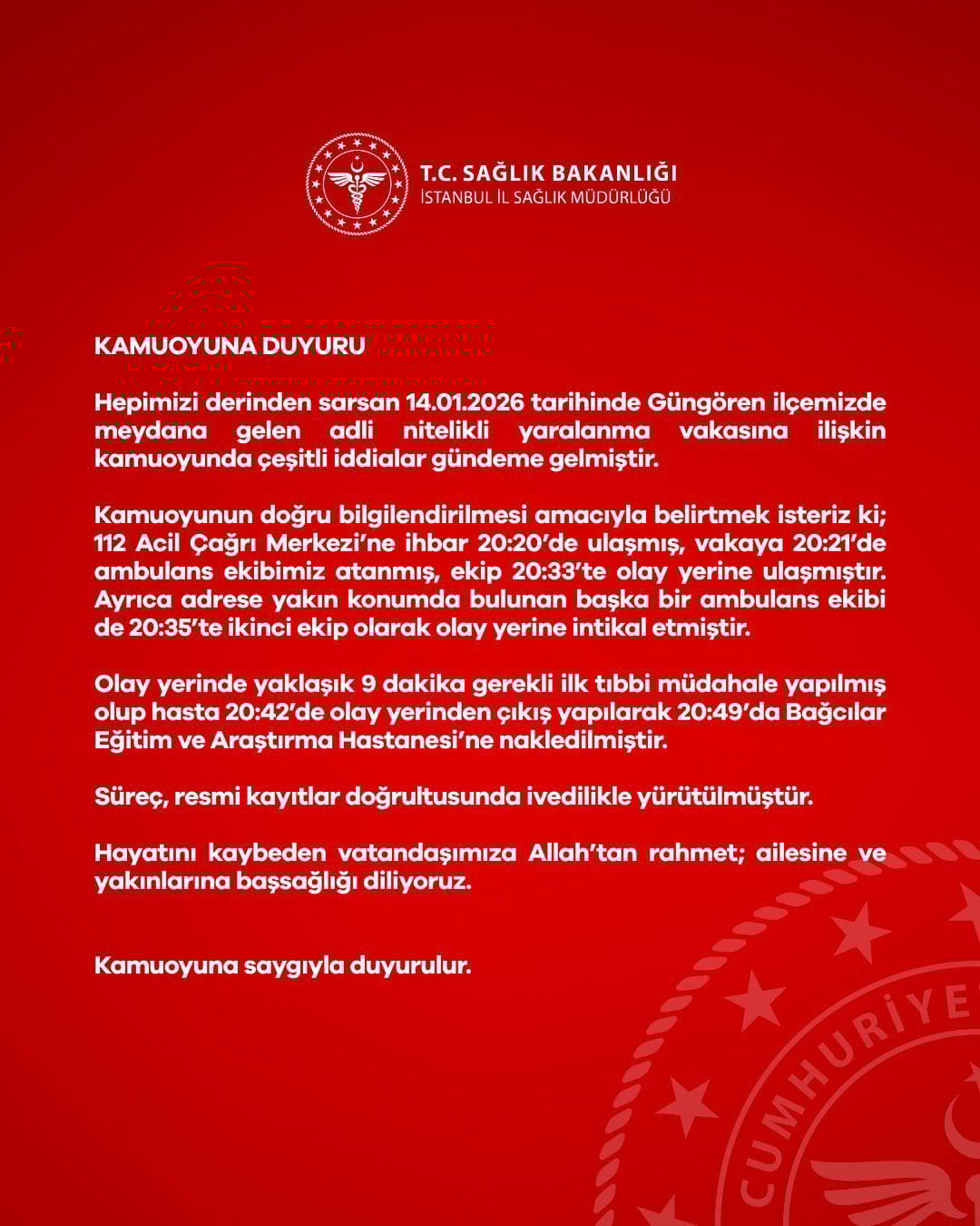 İL SAĞLIK MÜDÜRLÜĞÜ'NDEN AÇIKLAMAİl Sağlık Müdürlüğünden yapılan açıklamada, "14 Ocak'ta Güngören ilçesinde meydana gelen adli nitelikli yaralanma vakasına ilişkin kamuoyunda çeşitli iddiaların gündeme geldiği belirtildi. Açıklamada, şunlar kaydedildi: "Kamuoyunun doğru bilgilendirilmesi amacıyla belirtmek isteriz ki, 112 Acil Çağrı Merkezi'ne ihbar 20.20'de ulaşmış, vakaya 20.21'de ambulans ekibimiz atanmış, ekip 20.33'te olay yerine ulaşmıştır. Ayrıca adrese yakın konumda bulunan başka bir ambulans ekibi de 20.35'te ikinci ekip olarak olay yerine intikal etmiştir. Olay yerinde yaklaşık 9 dakika gerekli ilk tıbbi müdahale yapılmış olup, hasta 20.42'de olay yerinden çıkış yapılarak 20.49'da Bağcılar Eğitim ve Araştırma Hastanesine nakledilmiştir. Süreç resmi kayıtlar doğrultusunda ivedilikle yürütülmüştür. Hayatını kaybeden vatandaşımıza Allah'tan rahmet, ailesine ve yakınlarına baş sağlığı diliyoruz" ifadeleri yer aldı.