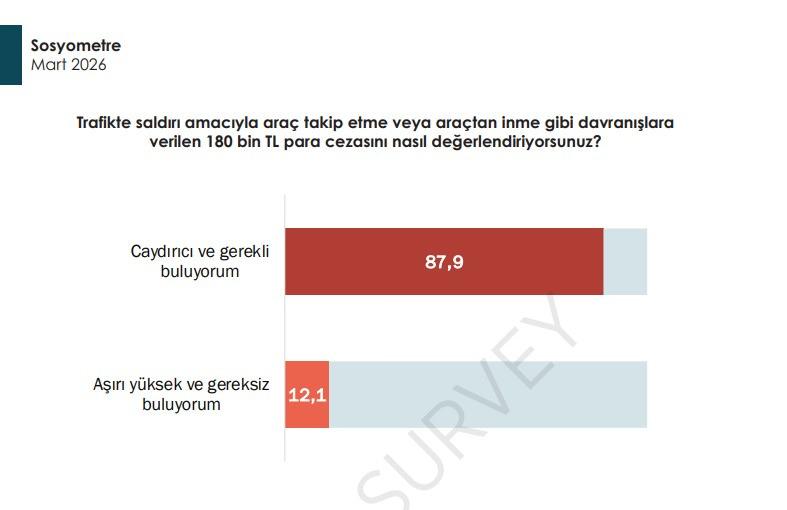 Çalışmada, katılımcılara yöneltilen sorulardan biri, "Trafikte saldırı amacıyla araç takip etme veya araçtan inme gibi davranışlara verilen 180 bin TL para cezasını nasıl değerlendiriyorsunuz?" şeklindeydi.