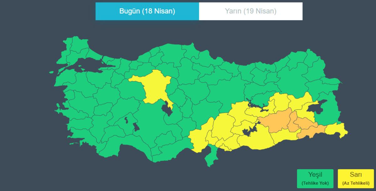 'Sarı' kodlu uyarı yapılan iller arasında, Adana, Adıyaman, Ankara, Bingöl, Bitlis, Elazığ, Gaziantep, Hakkari, Malatya, Kahramanmaraş, Mardin, Muş, Şanlıurfa, Kilis ve Osmaniye yer alırken 'turuncu' kodlu uyarı yapılan iller arasında ise Diyarbakır, Siirt, Batman ve Şırnak yer aldı.
