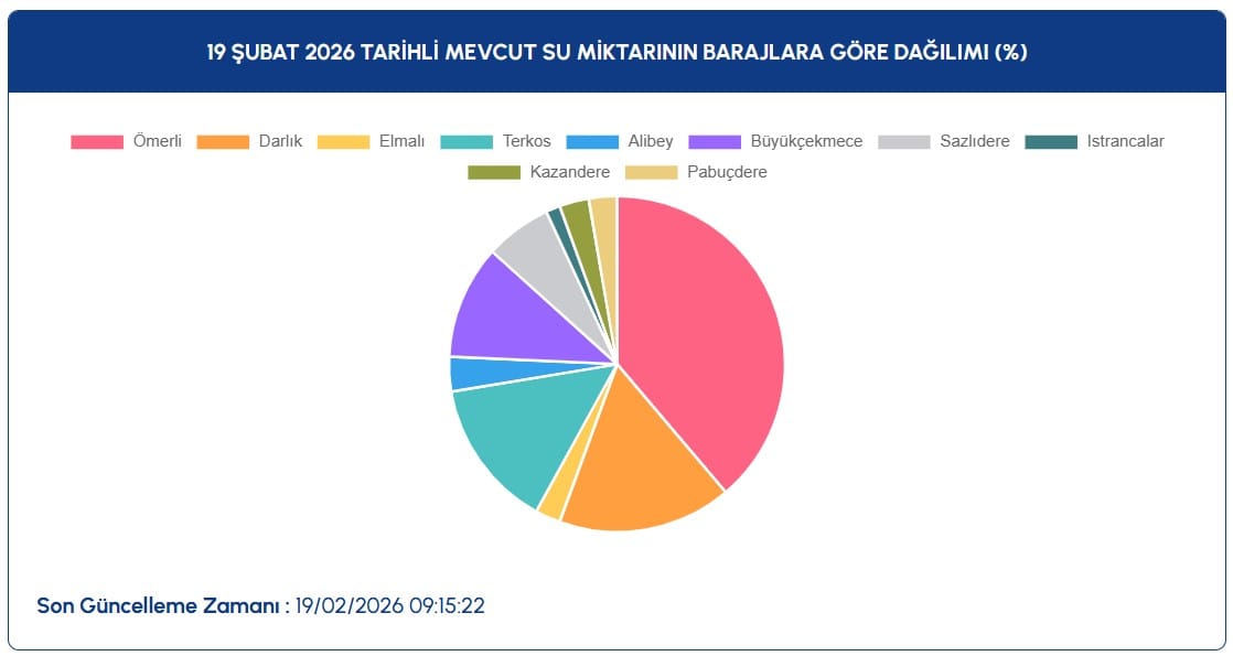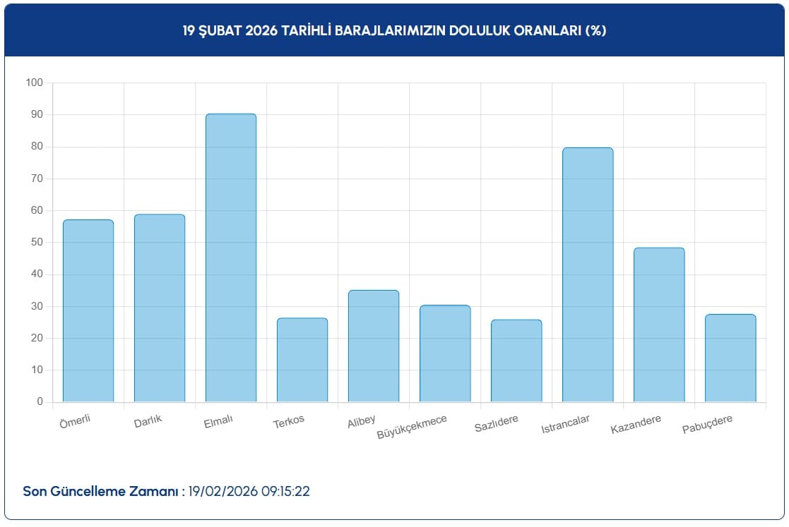 İstanbul Su ve Kanalizasyon İdaresi (İSKİ) verilerine göre 19 Şubat 2026 itibarıyla barajlardaki doluluk oranları şöyle: