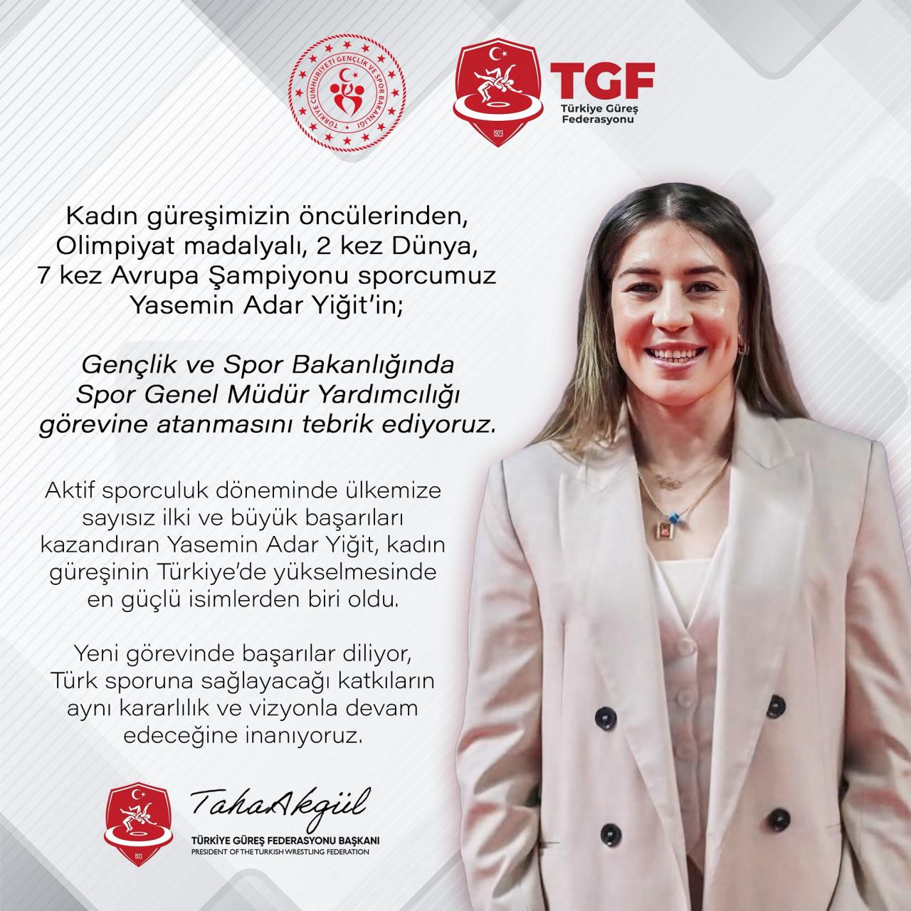 Açıklamada ayrıca "Aktif sporculuk döneminde ülkemize sayısız ilki ve büyük başarıları kazandıran Yasemin Adar Yiğit, kadın güreşinin Türkiye’de yükselmesinde en güçlü isimlerden biri oldu. Yeni görevinde başarılar diliyor, Türk sporuna sağlayacağı katkıların aynı kararlılık ve vizyonla devam edeceğine inanıyoruz." ifadeleri kullanıldı.