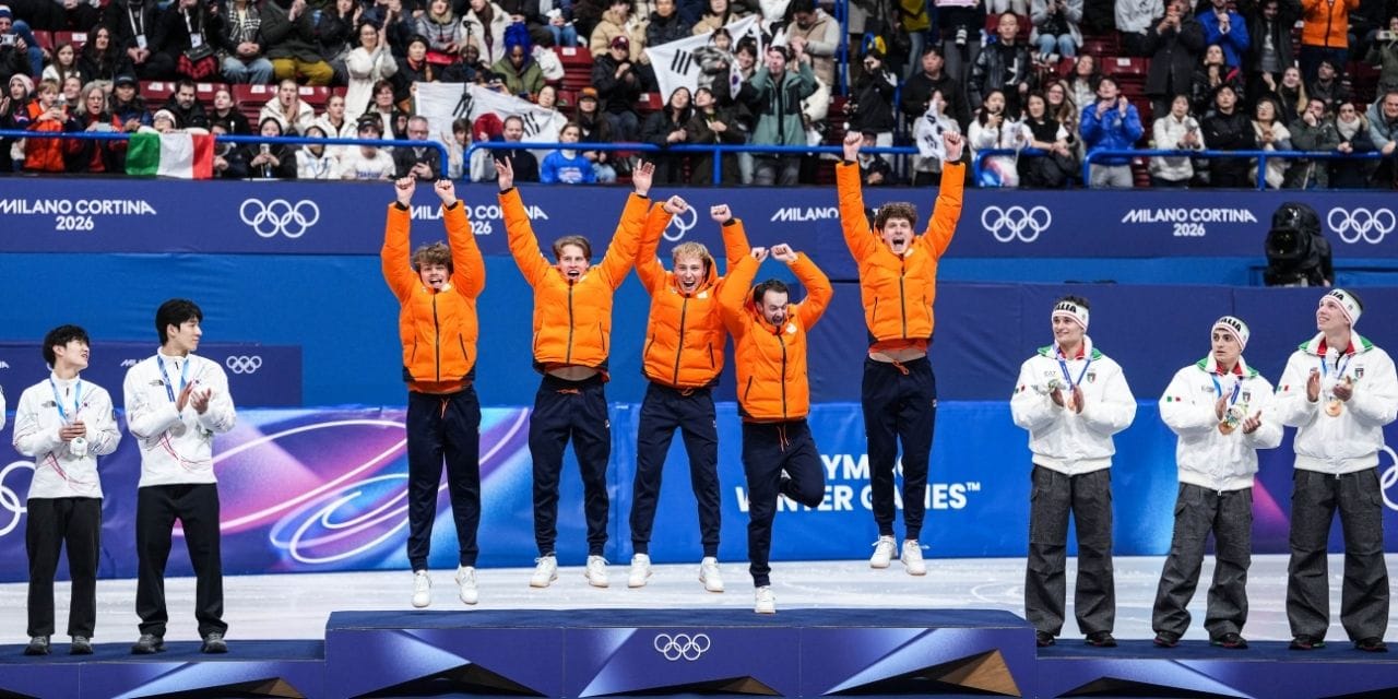Erkekler 5 bin metre bayrakta altın madalya, 6.51.847'lik derecesiyle Melle van 't Wout, Jens van 't Wout, Teun Boer ve Friso Emons'tan oluşan Hollanda'nın oldu. Jens van 't Wout, oyunlarda 3'ü altın, biri bronz olmak üzere 4. madalyasını kazandı. Yarışı Güney Kore gümüş, İtalya bronz madalyayla tamamladı.