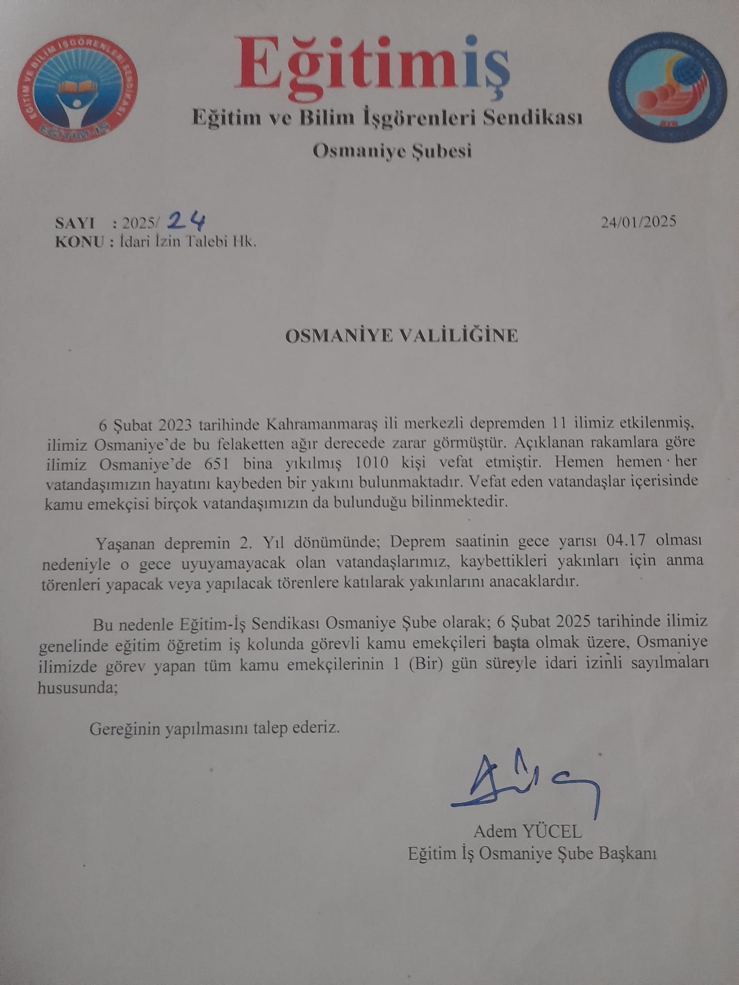 "50 binden fazla yurttaşımızı kaybettiğimiz 6 Şubat 2023 depreminin birinci ve ikinci yıl dönümünde Eğitim-İş Osmaniye Şubemiz; eğitim emekçilerinin ve halkımızın yaslarını tutabilmesi için bir günlük idari izin talebinde bulunmuştu. 'Bugün ders değil, yas günüdür' demişti. Ancak her iki yılda da talebimiz “eğitimin aksamaması” gibi bürokratik bir zırhın ardına sığınılarak reddedilmiştir.