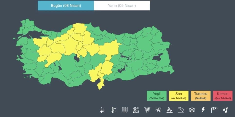 Sarı: Hava durumu potansiyel tehlikelidir. Tahmin edilen meteorolojik hadise olağandışı olmamakla birlikte, meteorolojik şartlardan etkilenebilecek faaliyetler konusunda dikkatli olunmalı.
