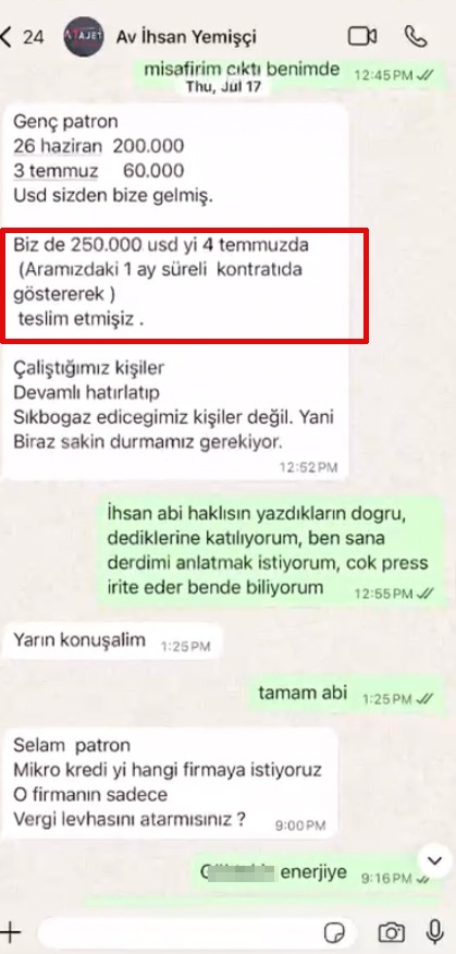 ‘PARAYI İADE EDİN’ MESAJI YANITSIZ KALDIAncak, 1 ayda çıkarılacağı vaat edilen kredi bir türlü çıkmadı. Bir süre sonra A. G., Yemişçi’ye ulaşmakta da zorlandı. Geçen 13 Eylül günü ise A. G., Yemişçi’ye gönderdiği mesajda verdikleri 260 bin doların iadesini istedi. Ancak olumlu bir yanıt alamadı. 24 Eylül günü ise 260 bin doların iadesi için ihtarname gönderildi. İhtarnameye de yanıt alınamayınca İhsan Yemişçi ve Hande Yemişçi’ye yönelik icra takibi başlatıldı. Baba-kız Yemişçiler takibe itiraz etti.