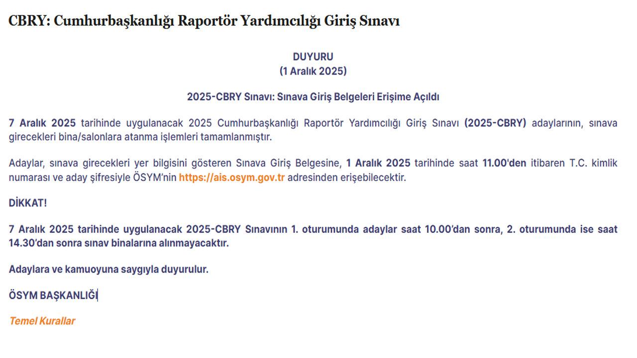 7 Aralık 2025 tarihinde uygulanacak 2025-CBRY Sınavının 1. oturumunda adaylar saat 10.00’dan sonra, 2. oturumunda ise saat 14.30’dan sonra sınav binalarına alınmayacaktır.