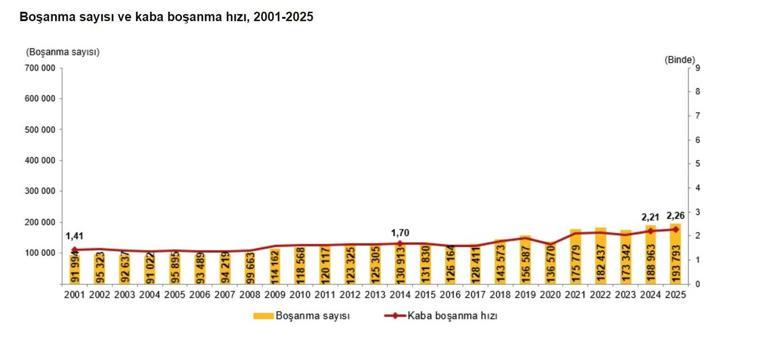 Kaba boşanma hızının 2025 yılında en yüksek olduğu il, binde 3,28 ile İzmir oldu. Bu ili binde 3,21 ile Antalya, binde 3,14 ile Denizli izledi. Kaba boşanma hızının en düşük olduğu il ise binde 0,51 ile Hakkari oldu. Bu ili binde 0,52 ile Şırnak, binde 0,63 ile Bitlis izledi. Evlilik süresine göre boşanmalar incelendiğinde, 2025 yılında gerçekleşen boşanmaların yüzde 34'ü evliliğin ilk 5 yılı, yüzde 20,3'ü ise evliliğin 6-10 yılı içinde gerçekleşti.