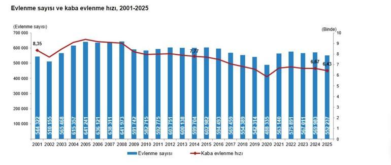 Türkiye İstatistik Kurumu (TÜİK), 2025 yılına ilişkin evlenme ve boşanma istatistiklerini açıkladı. Buna göre; evlenen çiftlerin sayısı 2024 yılında 569 bin 983 iken 2025 yılında 552 bin 237 oldu. Bin nüfus başına düşen evlenme sayısını ifade eden kaba evlenme hızı 2025 yılında binde 6,43 olarak gerçekleşti. Boşanan çiftlerin sayısı 2024 yılında 188 bin 963 iken 2025 yılında 193 bin 793 oldu. Bin nüfus başına düşen boşanma sayısını ifade eden kaba boşanma hızı 2025 yılında binde 2,26 olarak gerçekleşti.