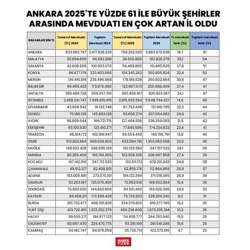 Başkenti Malatya ve Sakarya takip etti. Mega kent İstanbul'da ise toplam mevduat yüzde 46 artışla 11,7 trilyon liraya ulaştı. İstanbul Türkiye ortalamasına yakın bir mevduat büyümesi gerçekleştirdi. İstanbul'da da şirketlerin faizden faydalanmak için TL mevduatlarını artırdıkları görüldü. 2025'te mevduatı en az artan şehir ise yüzde 17 ile Kastamonu oldu. Kastamonu'da mevduat 58 milyardan 68 milyar liraya çıkabildi.