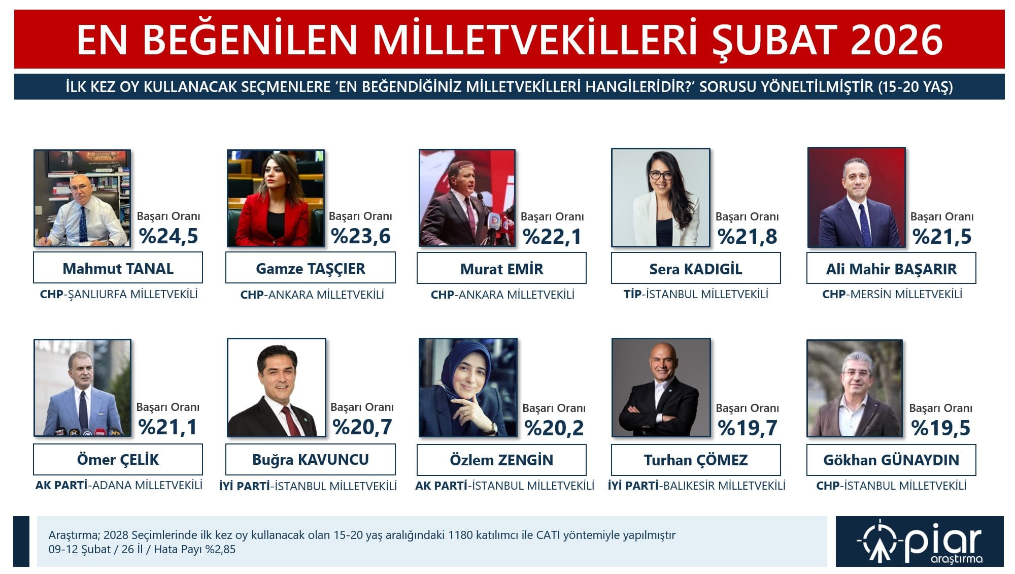 EN BEĞENİLEN MİLLETVEKİLİ MAHMUT TANAL!Yapılan araştırmada, katılımcılara “En beğendiğiniz milletvekilleri hangileridir?” sorusu da yönetilirken CHP’li Mahmut Tanal, yüzde 24,5 ile en beğenilen milletvekili oldu. Tanal’ı, yüzde 23,6 ile CHP Ankara Milletvekili Gamze Taşçıer takip ederken üçüncü sırada, yüzde 22,1 ile CHP’li Murat Emir yer aldı.