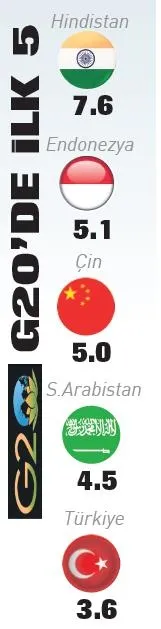 Türkiye, geçen yıla ilişkin verisi açıklanan Ekonomik İşbirliği ve Kalkınma Örgütü (OECD) ülkeleri arasında ekonomisi en hızlı büyüyen ilk 3 ülke arasında yer aldı. Türkiye, 3'üncülüğü yüzde 3.6 büyüme kaydeden Polonya ile paylaştı. OECD ülkelerinden en düşük büyüme kaydedenler ise yüzde 0.2 ile Almanya ve Finlandiya oldu. Türkiye, G20 ülkeleri içinde de 5'inci sırada yer aldı. Söz konusu ülkeler arasında 2025'te ekonomisi en hızlı büyüyen ülke yüzde 7.6 ile Hindistan oldu.