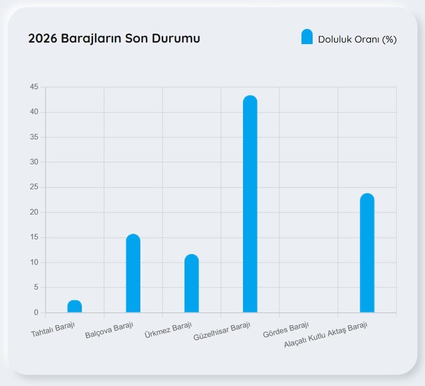 İZMİR BARAJLARINDA KRİTİK TABLOİzmir’de barajlar arasında en yüksek doluluk Güzelhisar’da görülürken, en düşük seviye Tahtalı’da kaydedildi. Ürkmez ve Balçova gibi kritik su kaynaklarında ise toparlanma sınırlı düzeyde seyrederken, Alaçatı Kutlu Aktaş orta seviyelerde yer aldı.