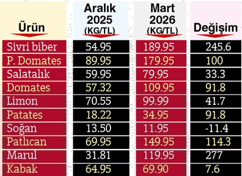 Aralık ayında 54.95 lira olan bir kilogram sivri biber fiyatı yüzde 245’lik artışla 3 ayda 189.95 liraya çıkarken, pembe domates fiyatı ise 89.95 liradan 179.95 liraya çıktı. Aralık ayında 31.81 lira olan marul fiyatı yüzde 277’lik rekor zam ile 119.95 liraya çıkarken, salatalık fiyatı aynı dönemde yüzde 33.3, domates yüzde 91.8, kabak yüzde 7.6, patlıcan yüzde 114.3 artış kaydetti.
