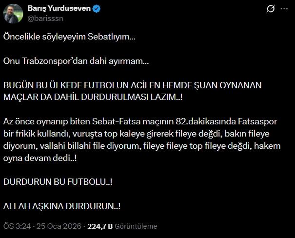 'MAÇLARIN ACİLEN DURDURULMASI LAZIM'Spor yorumcusu ve gazeteci Barış Yurduseven infiale neden olan pozisyonla ilgili sosyal medya hesabından yaptığı açıklamada Türkiye Futbol Fedarasyonu'na (TFF) seslendi.