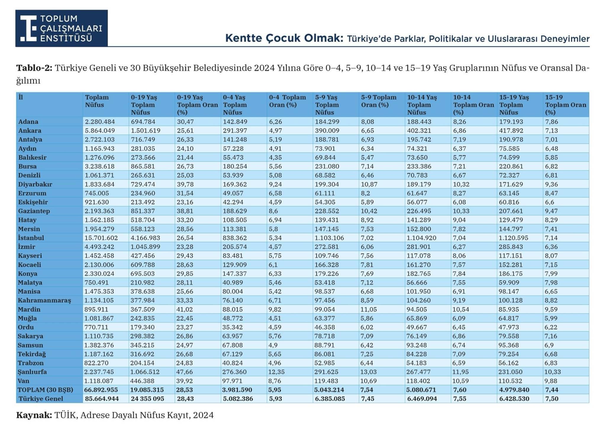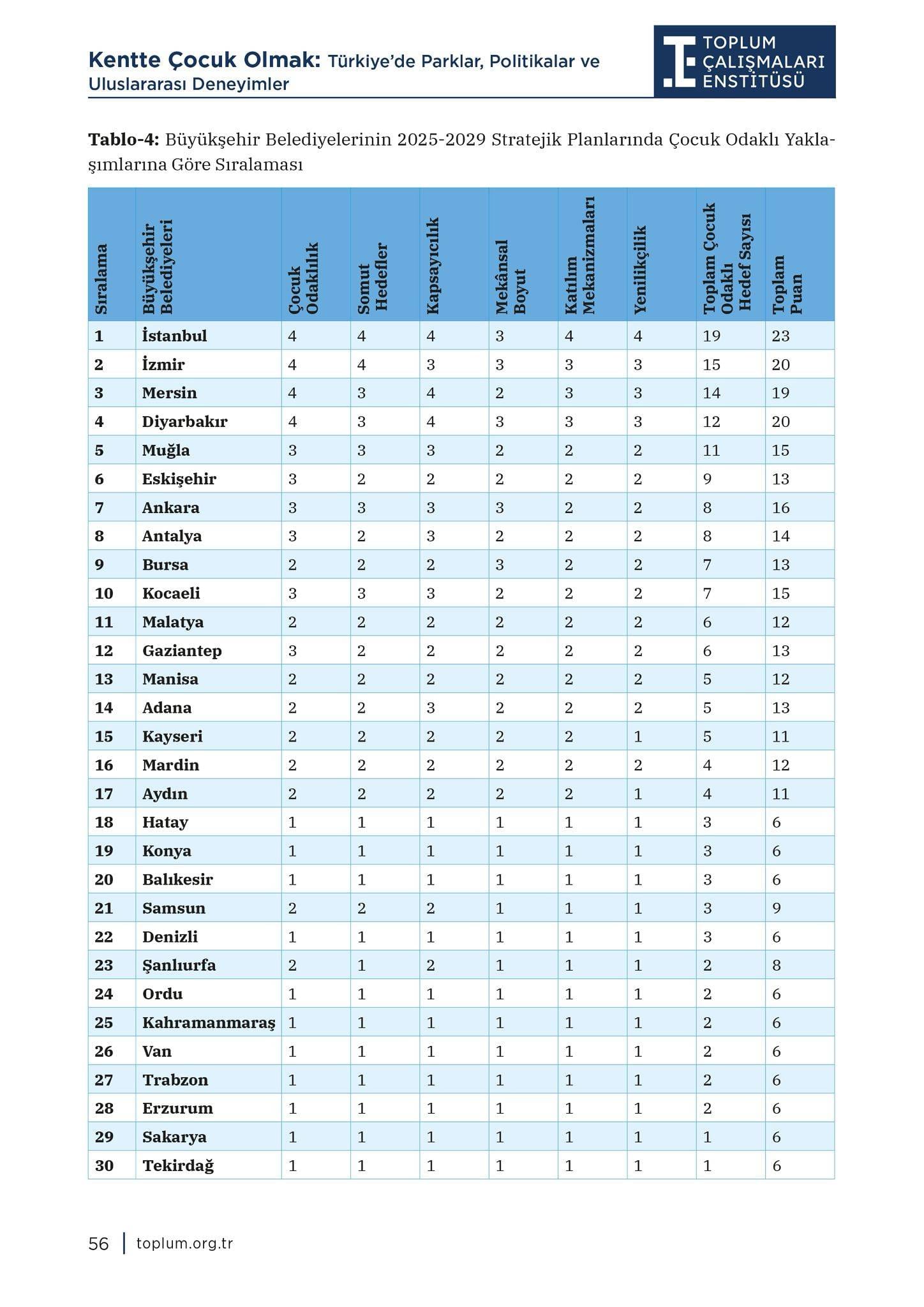 YALNIZCA 4 KENTTE ÇOCUK ODAKLI POLİTİKALAR İZLENİYORRaporda, büyükşehir belediyelerinin stratejik planları çocuk odaklılık, somut hedefler, kapsayıcılık, mekansal yaklaşım, katılım ve yenilikçilik başlıkları altında değerlendirildi. Yapılan analiz sonucunda yalnızca İstanbul, İzmir, Mersin ve Diyarbakır büyükşehir belediyelerinin çocukları merkeze alan bir yaklaşım geliştirdiği tespit edildi.
