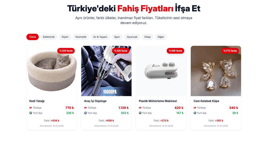 HEM TÜRKİYE FİYATINI HEM DE YURT DIŞI FİYATINI GÖRMEK MÜMKÜNHürriyet Partisi tarafından hayata geçirilen site, vatandaşların gönderdiği ürünlerin Türkiye'deki satış fiyatı ile yurt dışındaki fiyatını yan yana koyarak aradaki farkı yüzdesel olarak hesaplıyor. Sitede halihazırda elektronik, giyim, kozmetik ve spor gibi çok sayıda kategoride ürün bulunuyor.