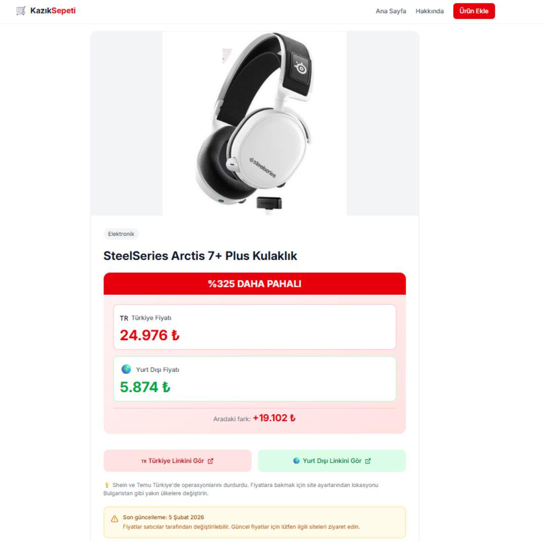 Örneğin, sitedeki bir kulaklık içeriğini ele alalım. Burada söz konusu kulaklığın Türkiye fiyatının 24.976 TL, yurt dışı fiyatının ise 5.874 TL olduğu bilgisine yer verilmiş. Buna ek olarak, kulaklığın Türkiye fiyatı ile yurt dışı fiyatı arasındaki farkın 19.102 TL olduğu gösterilerek "%325 daha pahalı" hesabı yapılmış.