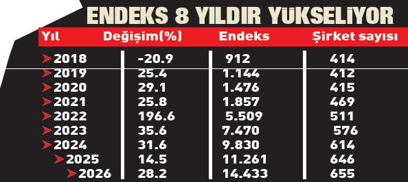 Geçtiğimiz yıl sergilediği yüzde 14.5'lik yükselişle yıllık enflasyonun yarısı kadar bir performans göstererek yatırımcıları hayal kırıklığına uğratan Borsa İstanbul, 2026'da adeta tarih yazıyor. Endeks geçtiğimiz haftaki yüzde 4.8'lik yükselişin ardından, dün de çifte rekor kırarak 14.400 puanı geçti. Endeks yıl başından bu yana, başka bir ifade ile 32 işlem gününde, yüzde 28'in üzerinde yükselerek, 2025'in tamamındaki performansını şimdiden ikiye katlamış oldu. Borsada endeks ocak ayında yüzde 22.88 yükselerek 1997'den bu yana en büyük ocak ayı yükselişine imza atmıştı.