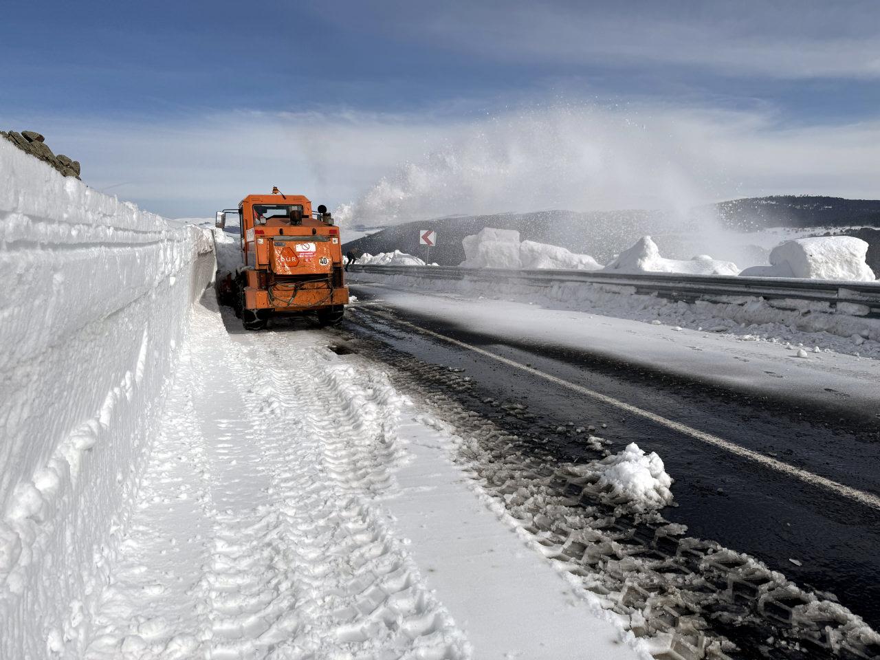 Karayolları 18’inci Bölge Müdürlüğüne bağlı 183’üncü Şube Şefliği ekipleri, kar kütlelerini rotatifle temizlerken, 2 greyder ve 2 kepçe de yolda çalışma yapıyor.