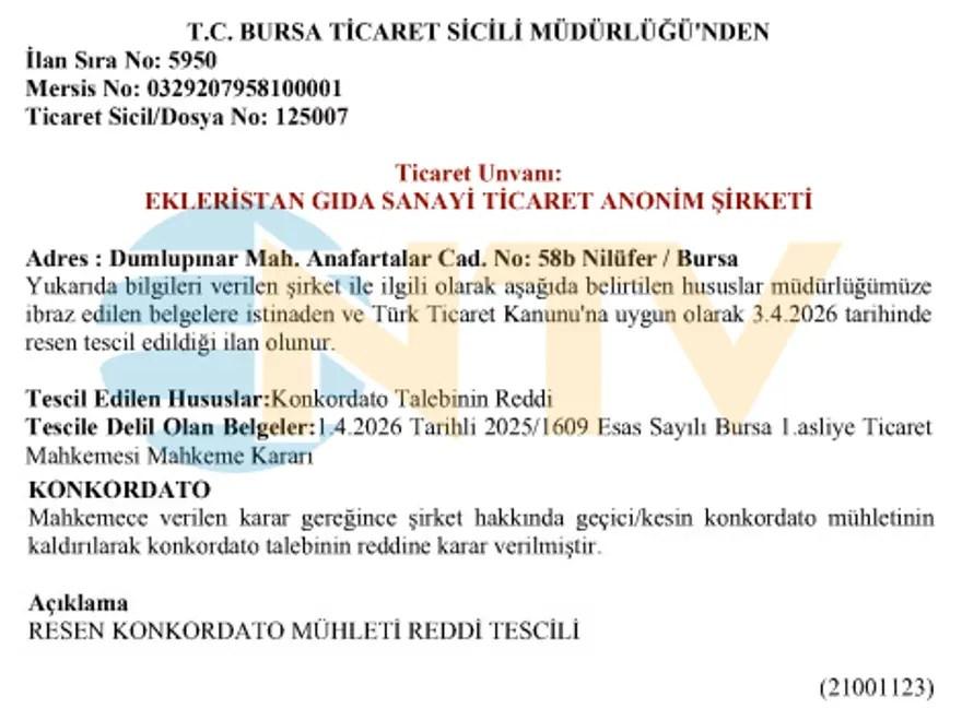 Türkiye'de 400'ün üzerine şubesi olan ve yeme-içme sektöründe bulunan Ekleristan iflas etti. Bursa 1'inci Asliye Ticaret Mahkemesi, Ekleristan Gıda, Cevizden Gıda ve Snowland Taşımacılık'ın konkordato taleplerini ayrı ayrı reddederek üç şirketin 1 Nisan 2026 saat 15:02 itibarıyla iflaslarına, iflas tasfiyesinin her üç şirket bakımından basit tasfiye olarak uygulanmasına, iflasın gecikmeksizin Bursa İflas Müdürlüğü'ne bildirilmesine karar verdi.