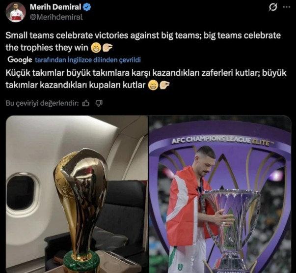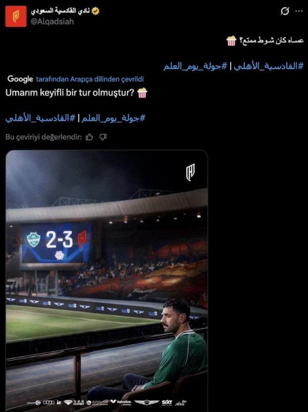 Maçın bitiş düdüğüyle birlikte Al Qadsiah resmi hesabından yapılan göndermeli paylaşımda Merih Demiral'ın görseli de kullanıldı.