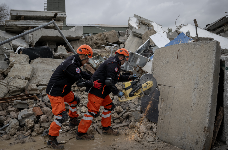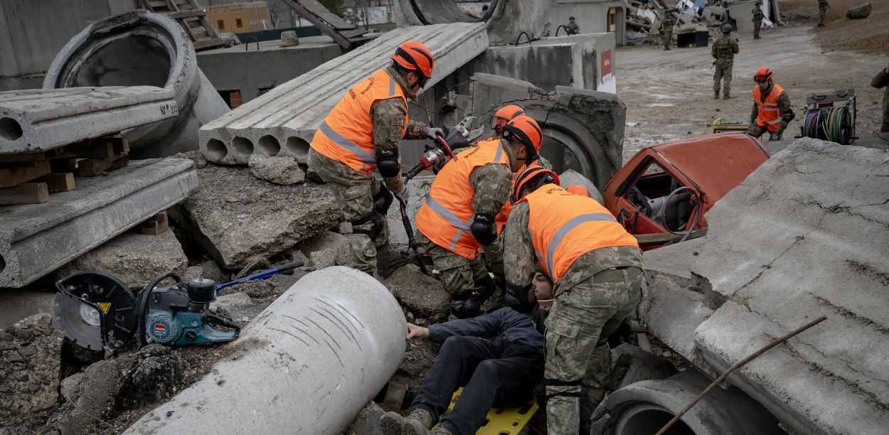 TSK İnsani Yardım Tugayı Doğal Afetler Arama Kurtarma (DAK) Taburu sorumluluğunda düzenlenen tatbikatta senaryo gereği enkaz altında kalanların yakınlarını olay yerinden uzak tutacak güvenlik şeritleri oluşturdu.