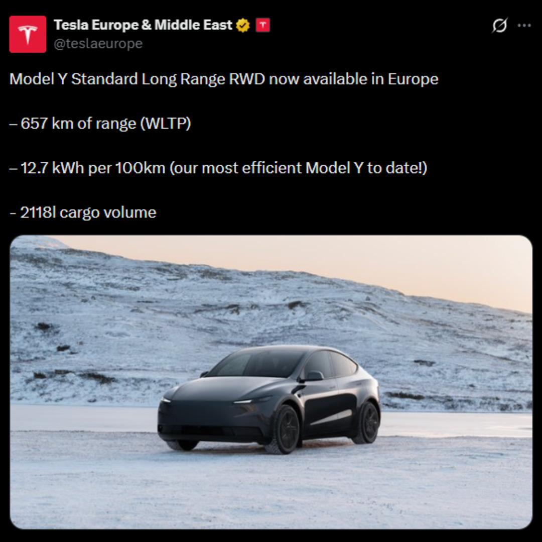 Tesla, sosyal medya platformu X üzerinden yaptığı açıklamada "Model Y Standard Long Range RWD artık Avrupa'da mevcut" açıklamasında bulundu.