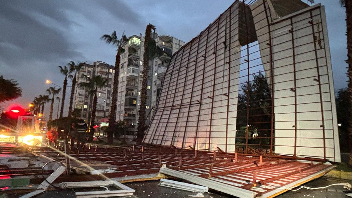 BİNANIN ÇATISI UÇTUKentte etkili olan sağanak, dolu ve şiddetli rüzgar sonrası birçok noktada hasar meydana geldi. Yol kenarlarında ve parkların içinde bulunan ağaçlar devrildi, panolar savruldu. Yörükoğlu Kavşağı’nda ise bir binanın metal çatısı, dolu ve şiddetli rüzgarın etkisiyle uçtu. Çatı, yol kenarındaki palmiye ağacına çarparak durdu. Yol güvenlik amacıyla trafiğe kapatılırken, ihbar üzerine olay yerine gelen itfaiye ekipleri, kesici aletlerle çatıyı parçalara ayırdı. Ardından yol temizlenerek trafiğe açıldı.