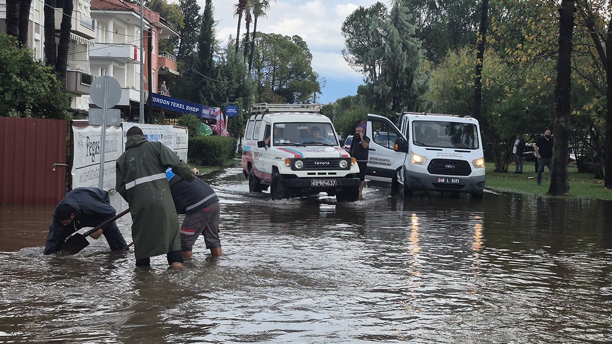 Köyceğiz ilçesinde de sağanak sonrası cadde ve sokaklar suyla kaplandı. Belediye ekipleri yollarda biriken yağmur sularının akışını sağlamak için tıkanan rögarları açmak için çaba sarf etti.
