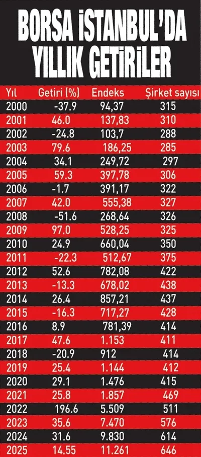 Borsa İstanbul, dezenflasyon programının uygulandığı ve önemli şokların yaşandığı 2025'te, tarihin en uzun yatay hareketi ile özellikle küçük yatırımcıları hayal kırıklığına uğratırken, yılı nominal olarak yükselişle tamamladı. Endeks yılı yüzde 14.5 artışla kapatırken, aynı zamanda tarihin en uzun yükseliş serisine imza attı. En son 2018'i düşüşle tamamlayan endeks, 8 yılın tamamında yükselerek önemli bir rekora imza attı. 2018'i 912 puanla kapatan endeksin son 7 yıldaki yükselişi yüzde bin 134'e ulaştı. Borsa yüzde 31 olması beklenen 2025 enflasyonuna göre reel olarak ise yüzde 14'e yakın değer kaybetmiş oldu. Endeks 26 Ağustos 2025'te 11.605 puanla tarihinin en yüksek seviyesini görüp 11.529 puanla da kapanış rekoru kırmıştı. 2025'te BIST 30 Endeksi yüzde 13.6, bankacılık endeksi yüzde 13.6 yükseldi.