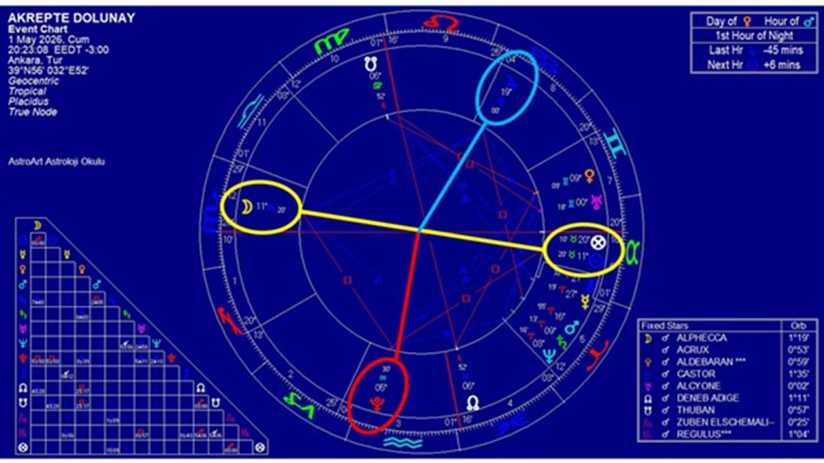 1 Mayıs Cuma akşamı Türkiye saatiyle 20:23’te Akrep burcunda dolunay gerçekleşiyor. Büyüme aşamasının zirve noktasına vardığı ve olayların da büyüme eğiliminin doruklarını test edeceği bu zaman diliminde, Ay’ın ufuk düzlemine yakın denk düştüğü bizim de bulunduğumuz bölgede önemli gelişmeler bekleyebiliriz. Bunlar, halkımızın sağlığı ve güvenliği ile ilgili konularda olabilir. Sismik aktivite de artabilir. Bu bağlamda Ege ve Marmara bölgeleri özellikle dikkat çekiyor.