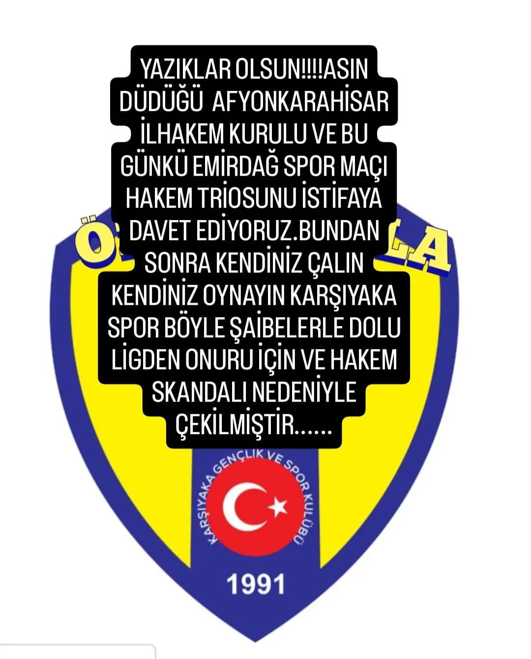 Emirdağspor'a karşı yaşanan olaylar ve hakem kararlarına tepki gösteren Afyon Karşıyakaspor, İl Hakem Kurulu'nu istifaya davet ederek, ''Afyonkarahisar İl Hakem Kurulu’nu istifaya davet ediyoruz… Bugünkü Emirdağspor maçında yaşanan skandal hakem kararları ile emeklerimiz çalınmış, kazandığımız maç 12 dakika uzatmalar verilerek skandal iki gol kararıyla maç ve 3 puanımız çalınmıştır. Oyuncularımızın ve camiamızın emek hırsızlarına tepki olarak ligden çekilme kararı almış bulunmaktayız; biraz vicdanınız varsa siz de düdük asın'' ifadelerini kullandı.