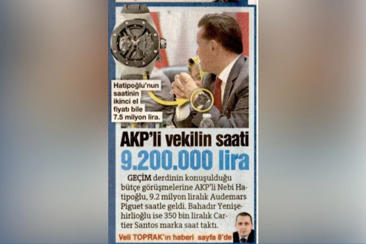 Lüks ve pahalı saatleriyle gündemden düşmeyen AKP Eskişehir Milletvekili Nebi Hatipoğlu, koleksiyonunun daha pahalı saatini taktı. Meclis bütçe görüşmelerine 9.2 milyonluk saatiyle gelen Hatipoğlu, Eskişehir’de katıldığı bir etkinlikte tam 441 bin dolarlık (yaklaşık 19 milyon) saatini taktı. Bu saatin ikinci eli dahi 11-17 milyon lira arasında değişiyor.