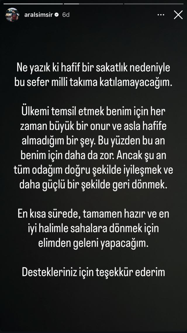 "EN KISA SÜREDE DÖNECEĞİM"Sosyal medya hesabından bir paylaşım yapan 23 yaşındaki sol kanat oyuncusu, "Ne yazık ki hafif bir sakatlık nedeniyle bu sefer milli takıma katılamayacağım. Ülkemi temsil etmek benim için her zaman büyük bir onur ve asla hafife almadığım bir şey. Bu yüzden bu an benim için daha da zor. Ancak şu an tüm odağım doğru şekilde iyileşmek ve daha güçlü bir şekilde geri dönmek. En kısa sürede, tamamen hazır ve en iyi halimle sahalara dönmek için elimden geleni yapacağım. Destekleriniz için teşekkür ederim." ifadelerini kullandı.