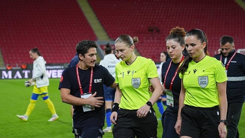 UEFA Uluslar B Ligi Play-Out rövanş karşılaşması öncesinde İzmir’deki Gürsel Aksel Stadı’nda beklenmedik bir olay yaşandı. Türkiye ile Kosova arasında oynanacak olan maçın Polonyalı orta hakemi Michalina Diakow, seremoni sırasında fenalaşarak baygınlık geçirdi.