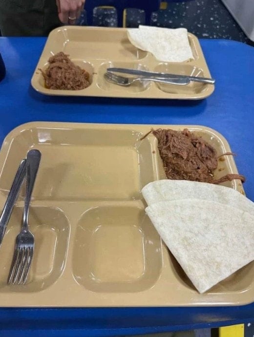 ABD Donanması’na ait USS Tripoli gemisinde görev yapan bir deniz piyadesinin ailesine gönderdiği yemek fotoğrafında, tepsinin büyük bölümünün boş olduğu, yalnızca az miktarda kıyılmış et ve bir tortilla bulunduğu görüldü. Benzer bir görüntü de USS Abraham Lincoln gemisinden paylaşıldı. Fotoğrafta birkaç haşlanmış havuç, kuru bir köfte ve işlenmiş et parçası yer aldı.