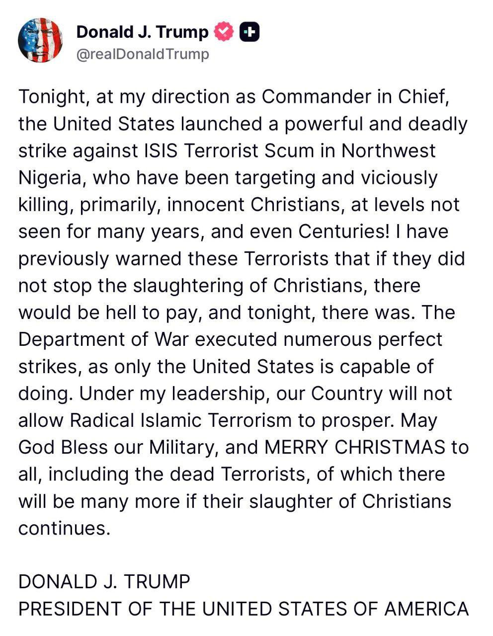ABD Başkanı Donald Trump, ABD ordusunun Kuzeybatı Nijerya'daki DEAŞ terör örgütü hedeflerine yönelik saldırı gerçekleştirdiğini duyurdu.