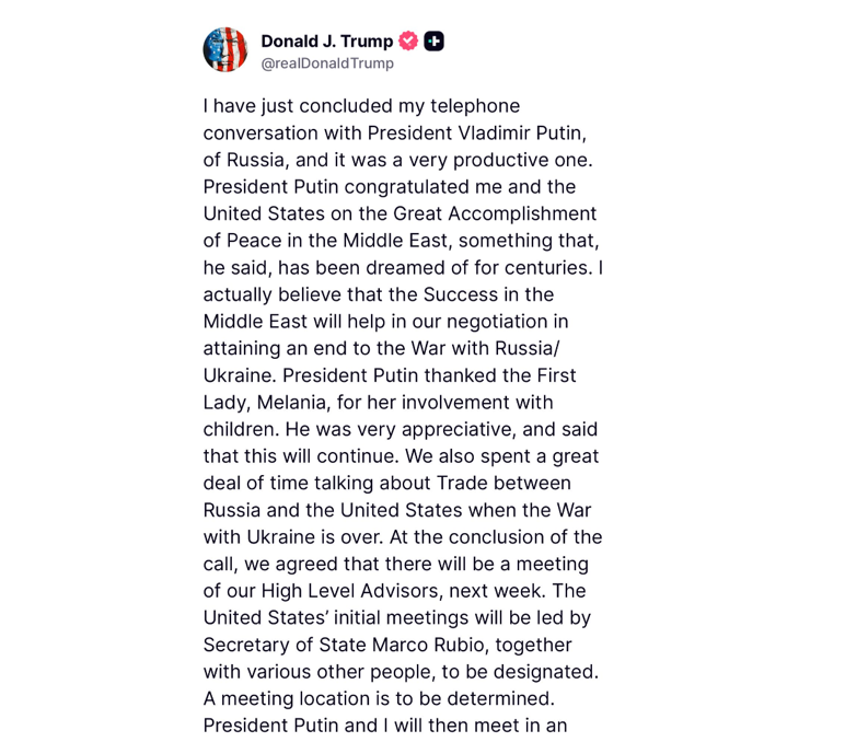 Trump sosyal medyadan konuyla ilgili açıklama yaparak, "Rusya Devlet Başkanı Vladimir Putin ile telefon görüşmemi yeni tamamladım ve çok verimli geçti. Başkan Putin, yüzyıllardır hayalini kurduğu Orta Doğu'da Barışın Büyük Başarısı için beni ve Amerika Birleşik Devletleri'ni tebrik etti. Orta Doğu'daki Başarının, Rusya/Ukrayna ile Savaşın sona ermesi için müzakerelerimize yardımcı olacağına inanıyorum. Başkan Putin, First Lady Melania'ya çocuklarla ilgilendiği için teşekkür etti. Çok minnettar olduğunu ve bunun devam edeceğini söyledi. Ayrıca, Ukrayna ile Savaş sona erdiğinde Rusya ve Amerika Birleşik Devletleri arasındaki ticaret hakkında uzun uzun konuştuk. Görüşmenin sonunda, gelecek hafta Üst Düzey Danışmanlarımızla bir toplantı yapılması konusunda anlaştık. Amerika Birleşik Devletleri'nin ilk toplantılarına Dışişleri Bakanı Marco Rubio başkanlık edecek ve belirlenecek diğer kişilerle birlikte toplantı yeri belirlenecek. Başkan Putin ve ben daha sonra, Rusya ile Ukrayna arasındaki bu "şansız" savaşı sona erdirip erdiremeyeceğimizi görüşmek üzere, kararlaştırılan bir yerde, Budapeşte, Macaristan'da bir araya geleceğiz. Başkan Zelenski ve ben yarın Oval Ofis'te bir araya geleceğiz ve burada Başkan Putin ile yaptığım görüşmeyi ve çok daha fazlasını ele alacağız. Bugünkü telefon görüşmesinde büyük ilerleme kaydedildiğine inanıyorum." ifadelerini kullandı.