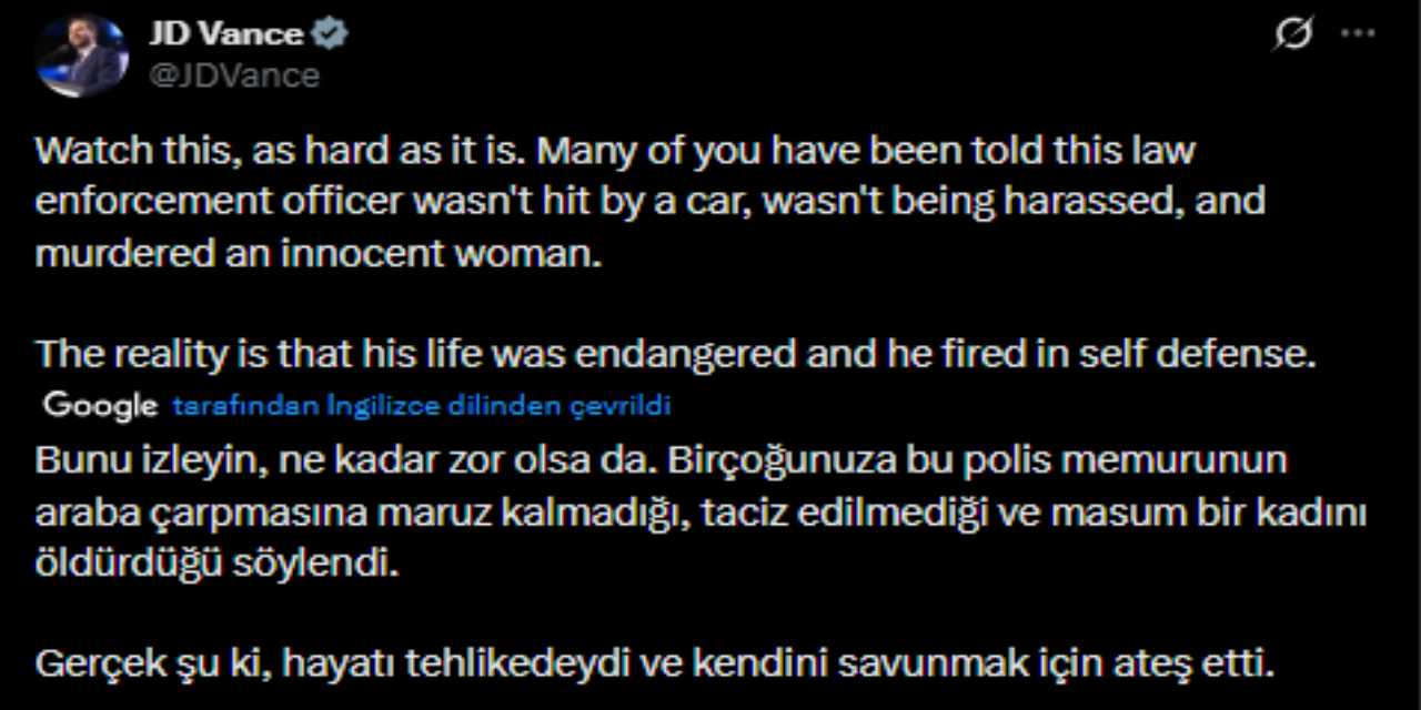 "KENDİNİ SAVUNMAK İÇİN ATEŞ ETTİ"Görüntüler, videonun Çarşamba günü Good’a ateş eden ICE ajanı Jonathan Ross tarafından telefonla çekildiği tahmin edilirken videoyu ABD Başkan Yardımcısı JD Vance, X hesabından paylaştı.