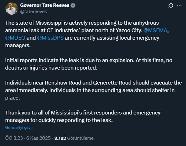 5 Kasım Çarşamba günü ABD'nin Mississippi eyaletindeki Yazoo City'nin kuzeyinde bulunan CF Industries tesisinde meydana gelen patlama amonyak sızıntısına neden oldu.